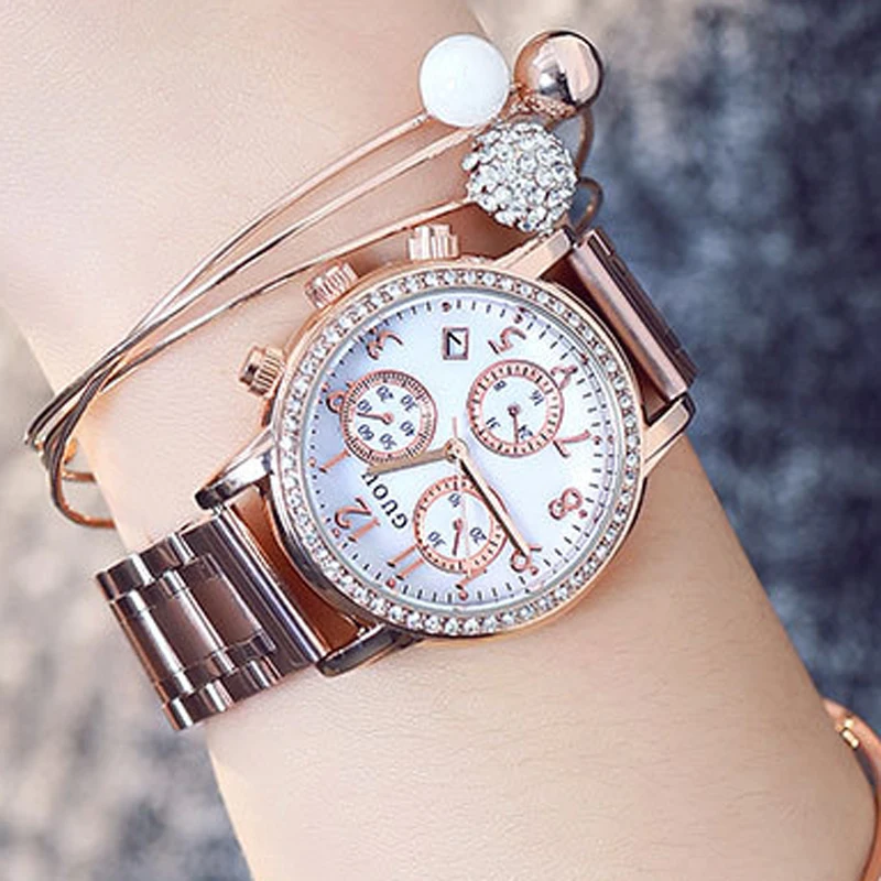 Kopen Goedkoop GUOU vrouwen Horloges Fashion Rvs Dames Horloge Rose Gouden Horloge Luxe Diamant Vrouwen Horloges Klok relogio feminino Prijs